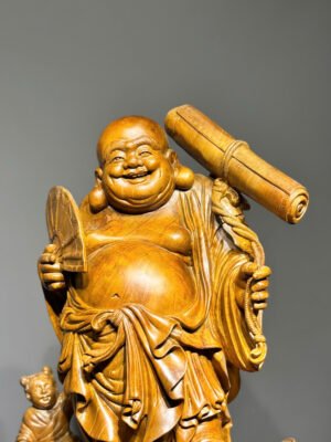 Tượng di lặc tam phúc có 3 trẻ em được chế tác thủ công hoàn toàn, đục sắc nét nguyên khối. Gỗ Ngọc AM có mùi thơm tốt cho sức khỏe.